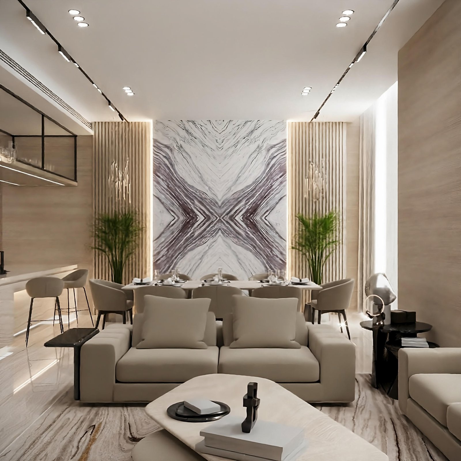 The living and dining areas are defined by a striking marble feature wall, complemented by warm wooden tones and integrated lighting that enhance depth and character. Carefully selected furniture in soft neutral shades creates a balance between sophistication and comfort, while greenery and curated décor add layers of freshness and personality.
