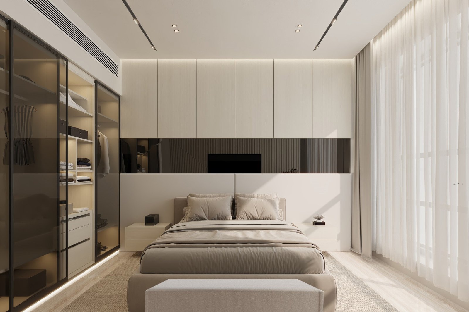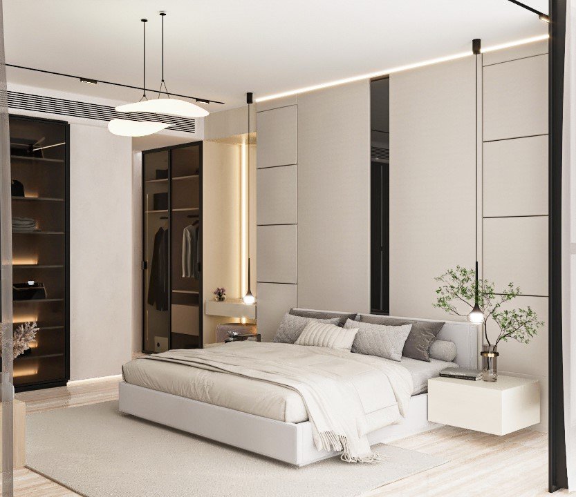 The bedroom continues this language of understated luxury with soft neutral tones, minimalistic finishes, and carefully layered lighting. Built-in wardrobes and streamlined joinery maintain clarity and order, while subtle accents add warmth and personality.