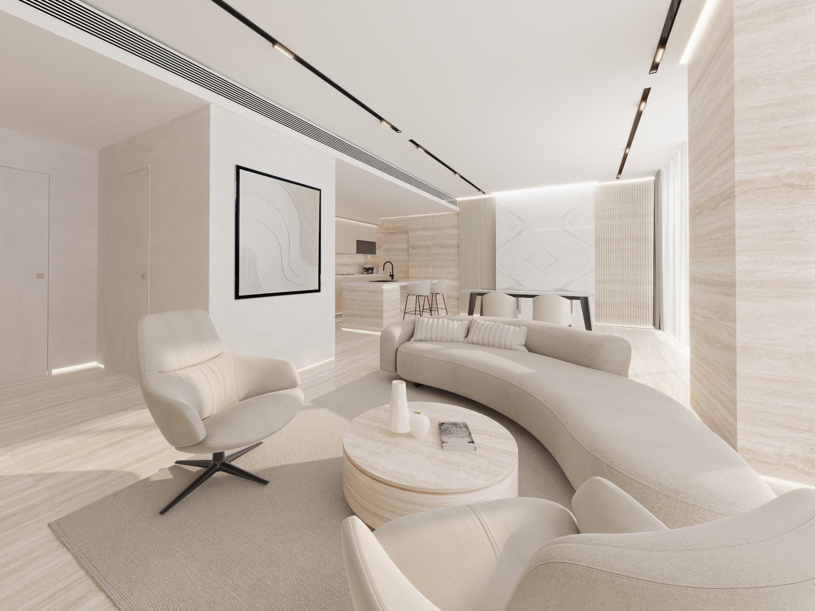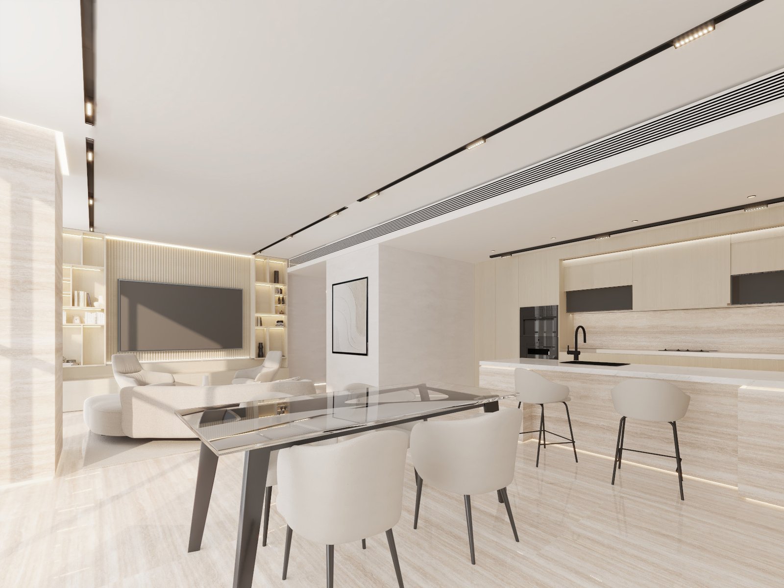 In the living areas, sculpted furniture pieces, warm textures, and integrated shelving are framed by clean architectural lines and ambient lighting, establishing a calm and inviting atmosphere. The open flow between spaces enhances connectivity, while bespoke detailing reflects an elevated lifestyle.
